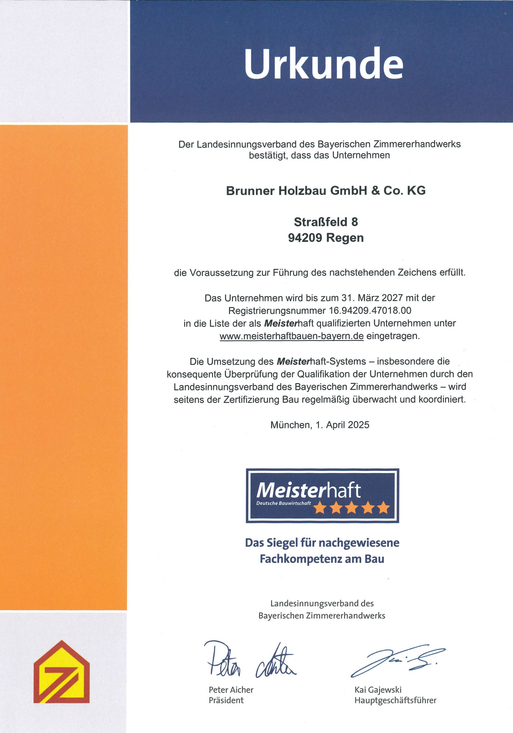 Robert Brunner hat seine Weiterbildung zum Zimmerermeister im Jahr 2014 erfolgreich abgeschlossen und im Jahr 2017 eine Zusatzqualifikation für Bauhandwerksmeister zur bautechnischen Nachweisberechtigung absolviert. Christoph Brunner legte seine Meisterprüfung im Jahr 2023 als Prüfungsbester ab und wurde dafür im Juli 2024 ausgezeichnet.